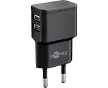 GoobayGoobay Chargeur USB domestique - Noir -Chargeur USB domestique - Noir -Chargeur USB domestique - Noir -Chargeur USB compact avec deux prises USB et un Courant de charge de 2400 mA Grâce à la forme extra plate et aux ports USB latéraux, il est également idéal pour une utilisation sur des prises avec peu d'espace, par exemple Armoires et tables, plans de travail, etc. Deux prises USB pour connecter des câbles de charge avec connecteur USB-A Le compagnon de voyage idéal grâce à la prise secteur 100 V à 240 V
