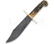 11.75" overall. 7.5" Damascus steel clip point blade. Stag Bone handle. Brass guard. Full tang. Brown leather belt sheath.