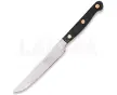 9.25" overall. 5" satin finish 440 stainless blade. Black wood handle. Stainless bolster(s). Full tang. Set of six.