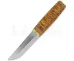 Risto MikkonenRisto Mikkonen Couteau VanaxCouteau VanaxCouteau VanaxLe puukko Vanax de Risto Mikkonen est une rareté en soi. Fondamentalement, cest un couteau finlandais très traditionnel, adapté au camping, à la sculpture sur bois et à toutes sortes dutilisations quotidiennes (EDC). Ce qui rend ce couteau spécial, cest lacier Vanax, rarement vu dans les puukkos finlandais. Cet acier en poudre est un excellent choix pour un couteau utilisé dans des conditions changeantes. Le Vanax ne craint ni les intempéries ni lhumidité, et il empêche la corrosion de manière extrêmement efficace. Lacier offre un excellent équilibre entre dureté et ténacité, ce qui le rend résistant à lusure et capable de supporter un certain stress (cest-à-dire des chocs). Malgré sa dureté, il nest pas du tout difficile à affûter. La lame mesure 10 centimètres, une taille idéale pour un couteau de plein air polyvalent. Laspect scandinave traditionnel est apporté par une belle poignée en bouleau moucheté avec des ferrures en laiton brillant, ainsi quun fourreau en cuir soli