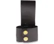 Dimensions: 76 mm x 51 mm x 140 mm. Snap closure. Black leather belt sheath.