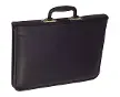 Measures 356 mm x 267 mm x 35 mm overall. Black imitation leather exterior with swing handle. Red felt lined interior with elastic straps...