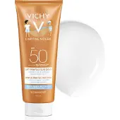 Cette crème solaire pour enfants offre une excellente protection UV avec SPF 50+ et est spécialement formulée pour les peaux sensibles. Le produit est résistant à l'eau et reste efficace après la baignade. La formule hypoallergénique sans parabènes ni parfum est testée dermatologiquement et pédiatriquement, ce qui la rend sûre pour les enfants. Elle contient de l'eau thermale de Vichy qui hydrate et apaise la peau. Les utilisateurs apprécient particulièrement l'efficacité et la douceur, bien que certains notent qu'un voile blanc peut apparaître s'il n'est pas bien travaillé.