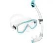 Ensemble haut de gamme masque (ESTRELLA) et tuba présenté en kit avec sac réutilisable en PVC. Couleur : transparent et aigue-marine.