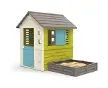 SmobySmoby Arenero House DoréArenero House DoréArenero House DoréLa maison Smoby Square solide et colorée offre beaucoup d`espace pour que les enfants puissent jouer et se cacher. La palette de couleurs tendance en turquoise et vert donne à la maison de jeu son aspect frais et moderne. Les quatre parois latérales robustes sont richement détaillées, des papillons et un petit chat ornent la façade du chalet, lui donnant un extérieur amusant. Deux fenêtres à lamelles et deux volets coulissants à ouvrir et à fermer, une petite porte d`entrée et une fenêtre supplémentaire à l`arrière de la maison complètent les caractéristiques adaptées aux enfants de cet équipement de jeu polyvalent. Grâce au procédé de fabrication spécial, l`abri de jardin est un jeu d`enfant à assembler et particulièrement robuste. Fabriquée en plastique de haute qualité et résistant aux UV, la maison carrée de Smoby est particulièrement résistante aux intempéries et à la décoloration. Pour encore plus d`options de jeu, la maison de jeu est livrée avec un bac à sable et un lit de plan