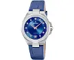 Montre facile quartz pour femme. Boîtier round de acier inoxydable, couleur gris. Bracelet de cuir, couleur bleu, avec fermeture ardillon...